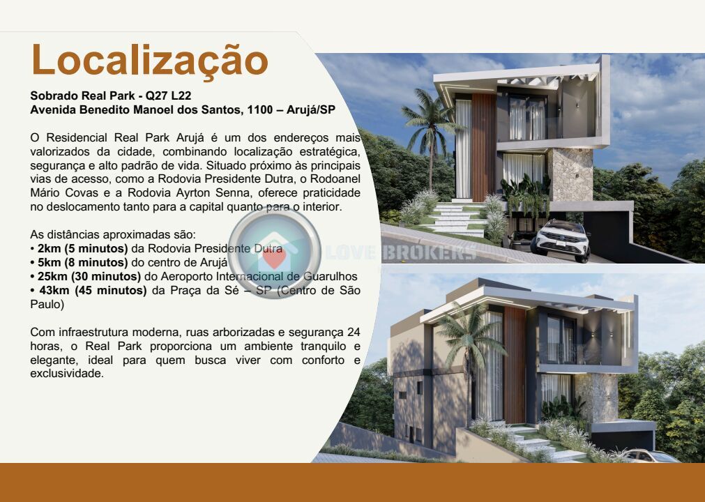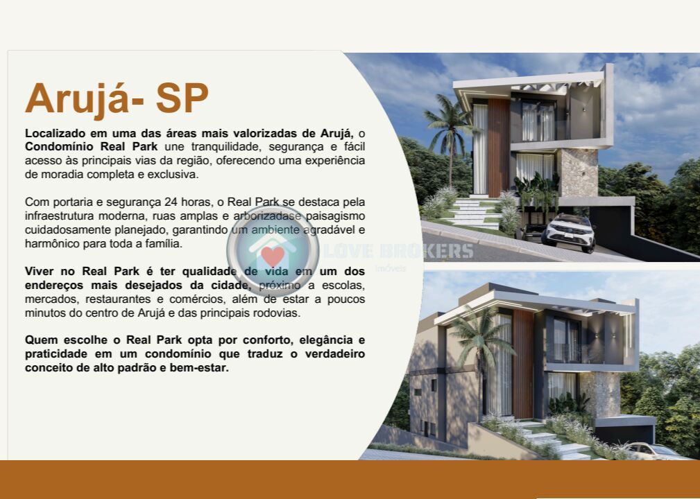 Localizado em uma das áreas mais valorizadas de Arujá, o Condomínio Real Park une tranquilidade, segurança e fácil acesso às principais vias da região, oferecendo uma experiência de moradia completa e exclusiva.