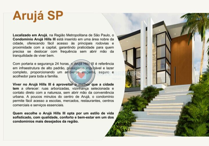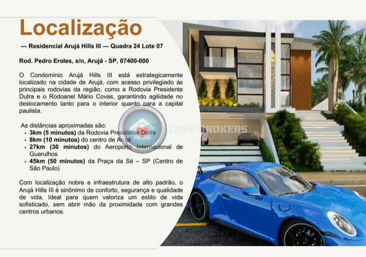 3km (5 minutos) da Rodovia Presidente Dutra 8km (10 minutos) do centro de Arujá 27km (30 minutos) do Aeroporto Internacional de Guarulhos 45km (50 minutos) da Praça da Sé – SP (Centro de São Paulo) Com localização nobre e infraestrutura de alto padrão, o Arujá Hills III é sinônimo de conforto, segurança e qualidade de vida. Ideal para quem valoriza um estilo de vida sofisticado, sem abrir mão da proximidade com grandes centros urbanos.
