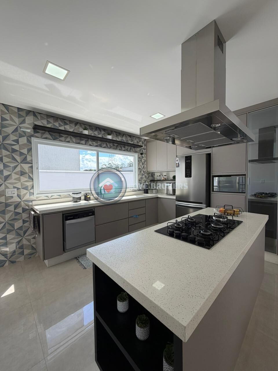 - Cozinha com ilha central e cooktop instalado